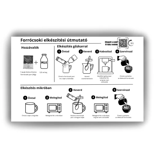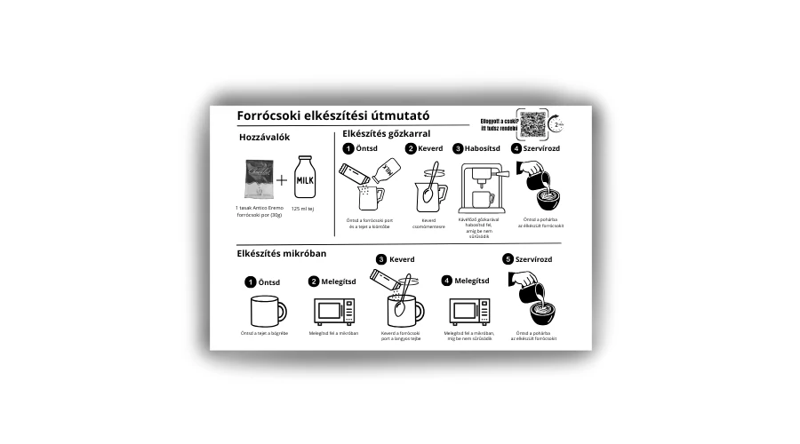 Ez a laminált útmutató kifejezetten az Antico Eremo forrócsoki elkészítéséhez készült, hogy a pultban dolgozó kollégák mindig gyorsan és magabiztosan tudják elkészíteni a tökéletes italt – akár gőzkarral, akár mikróban. A lapon minden lépés egyértelműen, ikonokkal van bemutatva, így egy pillantás is elég az eligazodáshoz.