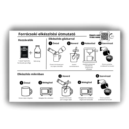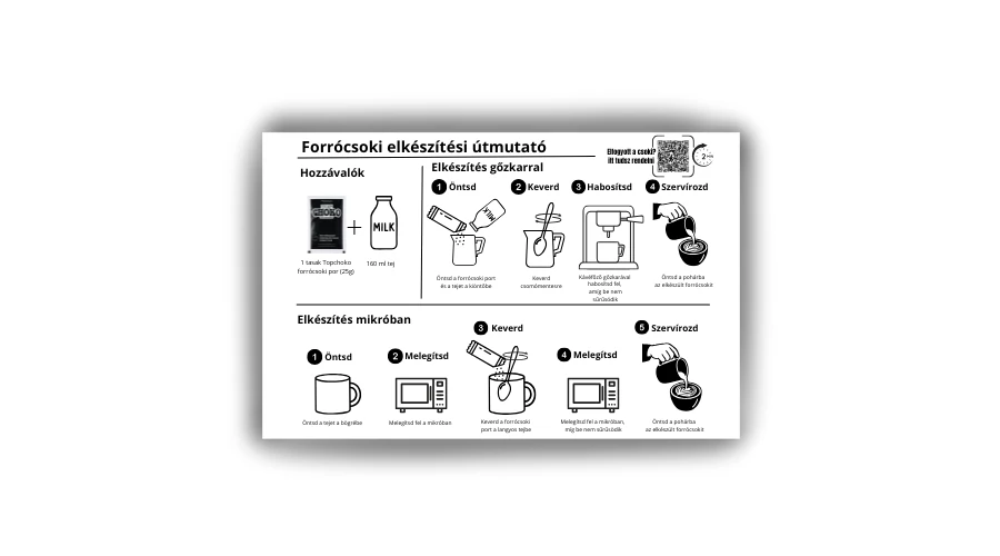 A cél, hogy minden vendég ugyanolyan gazdag ízű, selymes állagú Topchoko forrócsokit kapjon – bármelyik munkatárs készíti. A laminált útmutató strapabíró, könnyen tisztítható, és mindig kéznél van a pultban.